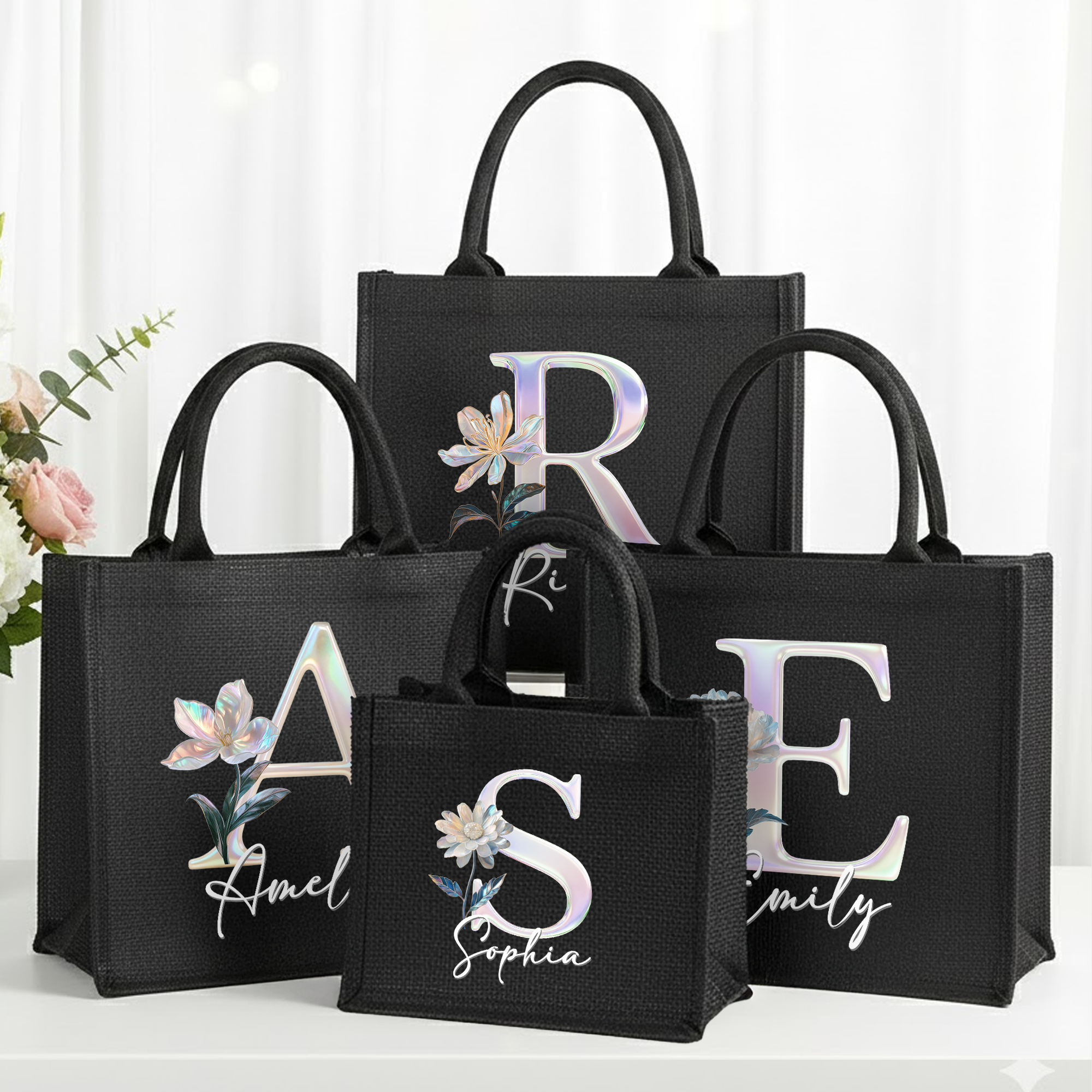 Personalized Name Mother of Pearl Effect Initial Birth Flower Tote Bag, Large Capacity Jute Bag, Birthday/Wedding Gift for Her/Mom/Bridesmaids